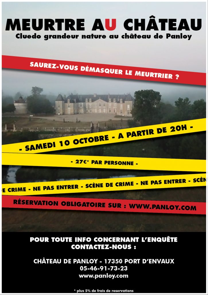Construit sous Louis XV aux bords de la Charente, le Château de Panloy vous accueille dans un cadre historique pour une soirée énigmatique. Le 17 juin 2022, le Château ouvre ses portes aux détectives amateurs pour une soirée Murder Party frissonnante. En effet, un meurtre a été commis en fin d’après-midi dans le Château, 13Lire la suite « Murder Party au Château de Panloy le 17 juin 2022 »